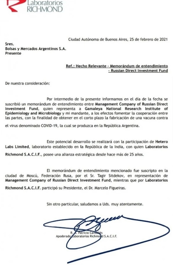 El laboratorio Richmond de la Argentina firmó un memorándum de entendimiento con la Sociedad Gestora del Fondo Ruso de Inversión Directa (RDIF), para producir la vacuna Sputnik V contra el coronavirus en el país, según informó la empresa.